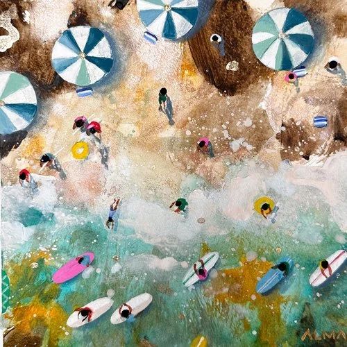 Alma's artwork centers on birds-eye view seascapes, where she masterfully captures the expansive beauty of the ocean from above. Through the use of rich textures, fluid paints and metallic inks, Alma creates dynamic pieces that reflect the movement and depth of the sea, offering viewers a fresh perspective on the world beneath.