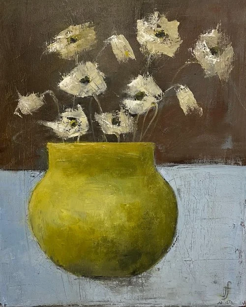 To side step the (near) photorealism of many who work in this genre, she chooses instead to paint instantly recognisable objects (but perhaps with a difference!). To a vase of flowers, she adds her sense of movement and fun. This approach gives her work a playful and dynamic feel which makes her paintings instantly approachable and often a point of conversation.