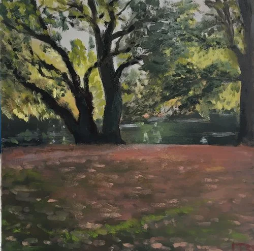 I normally travel a lot collecting material for paintings from a wide range of locations. Lockdown put a temporary stop to that but provided the opportunity to produce a series of work based on the immediate district where I live in London. The result has been the “Battersea Park” Series. The cycle of seasons in different weather and times of day with the changes in colour and mood create a variety of visual stories. Ranging from stark, spare winter to leafy summer; from early morning raking light to shadowy late evening.